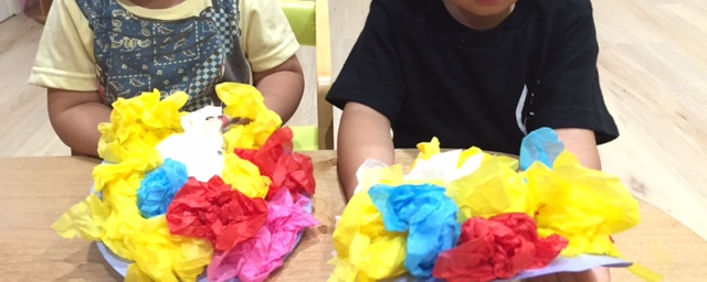 ビリビリちぎったりして、丸い画用紙にぺたぺた貼ります。